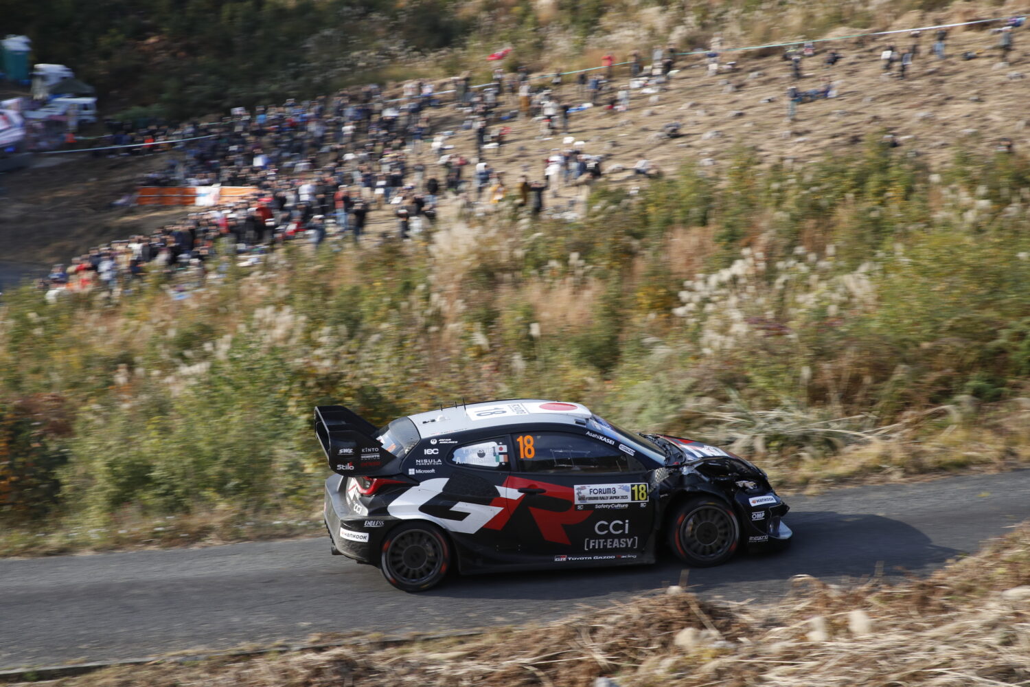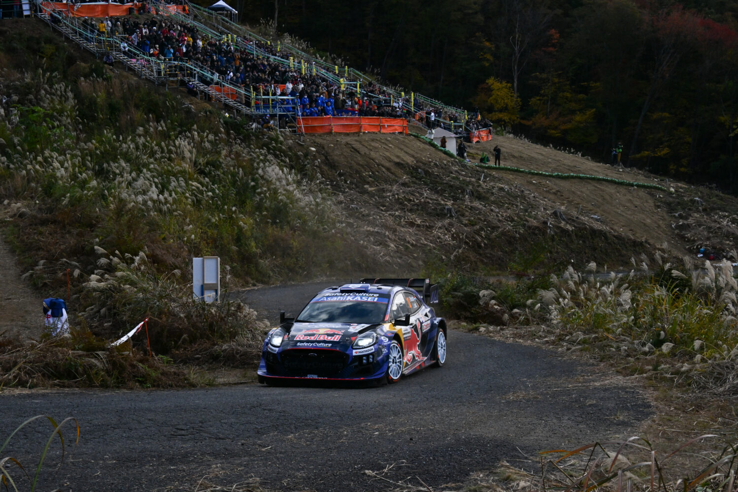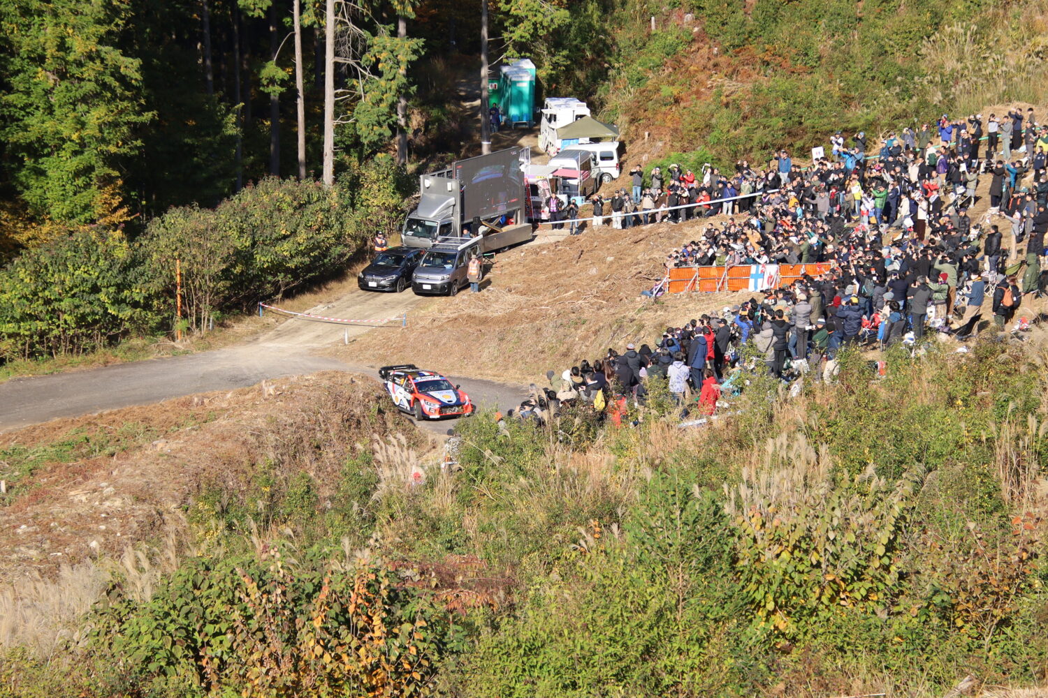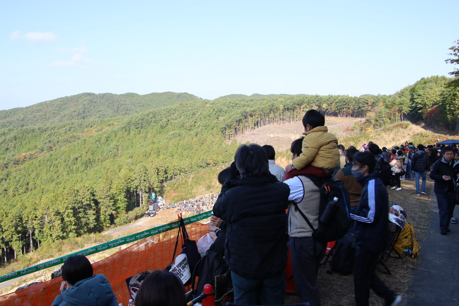 観客が見守る中つづら折りの稜線を駆け抜けるラリーカー